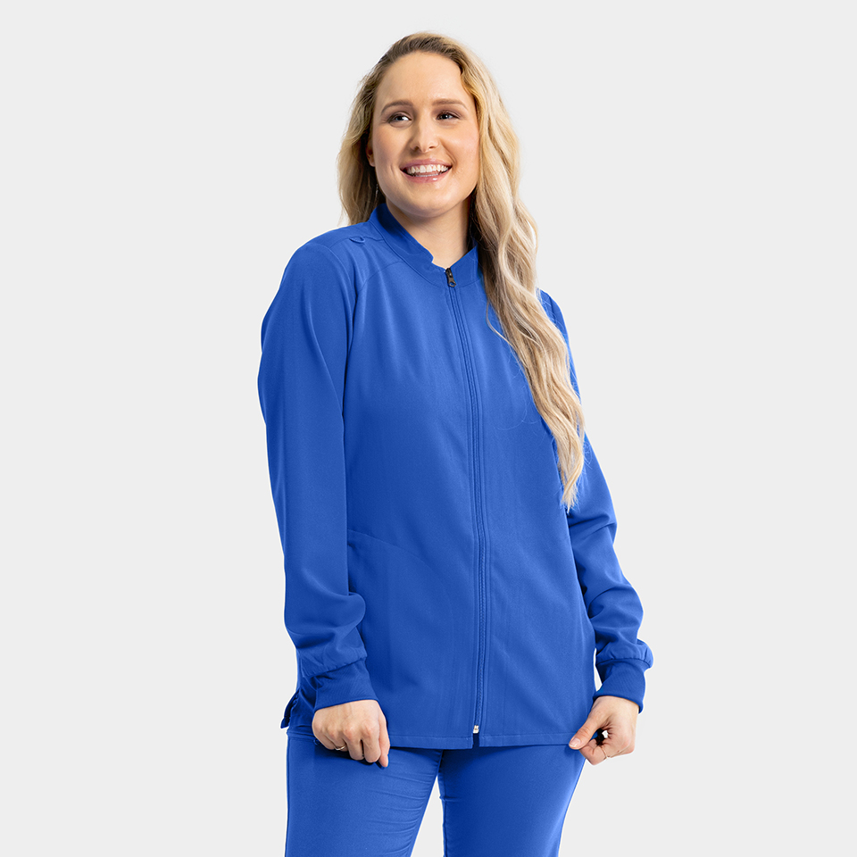 This luxurious jacket is made from a blend of polyester, rayon, and spandex, ensuring the perfect fit and maximum comfort. Featuring long sleeves with full ribbed cuffs, two front side pockets at princess seams, and functional contrast bungee loop at the shoulder seam, this jacket offers both style and functionality. The front shoulder seams, front and back princess seams add even more style and shape to this already stunning jacket. One of our best selling jackets! [search_terms: Elite-By-IRG IRG-Scrubs]